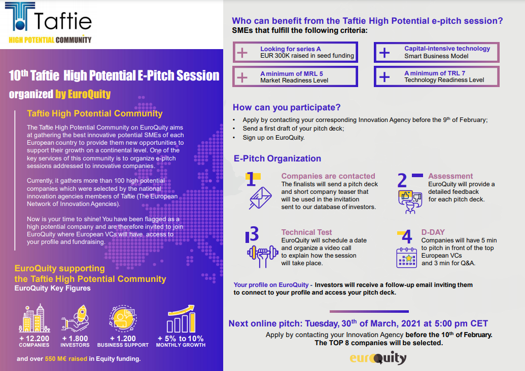 ePitch organizowany jest przez francuski bank BPI France we współpracy z europejską platformą startupową EuroQuity. Sesja pitchingowa jest otwarta dla wszystkich sektorów gospodarki.